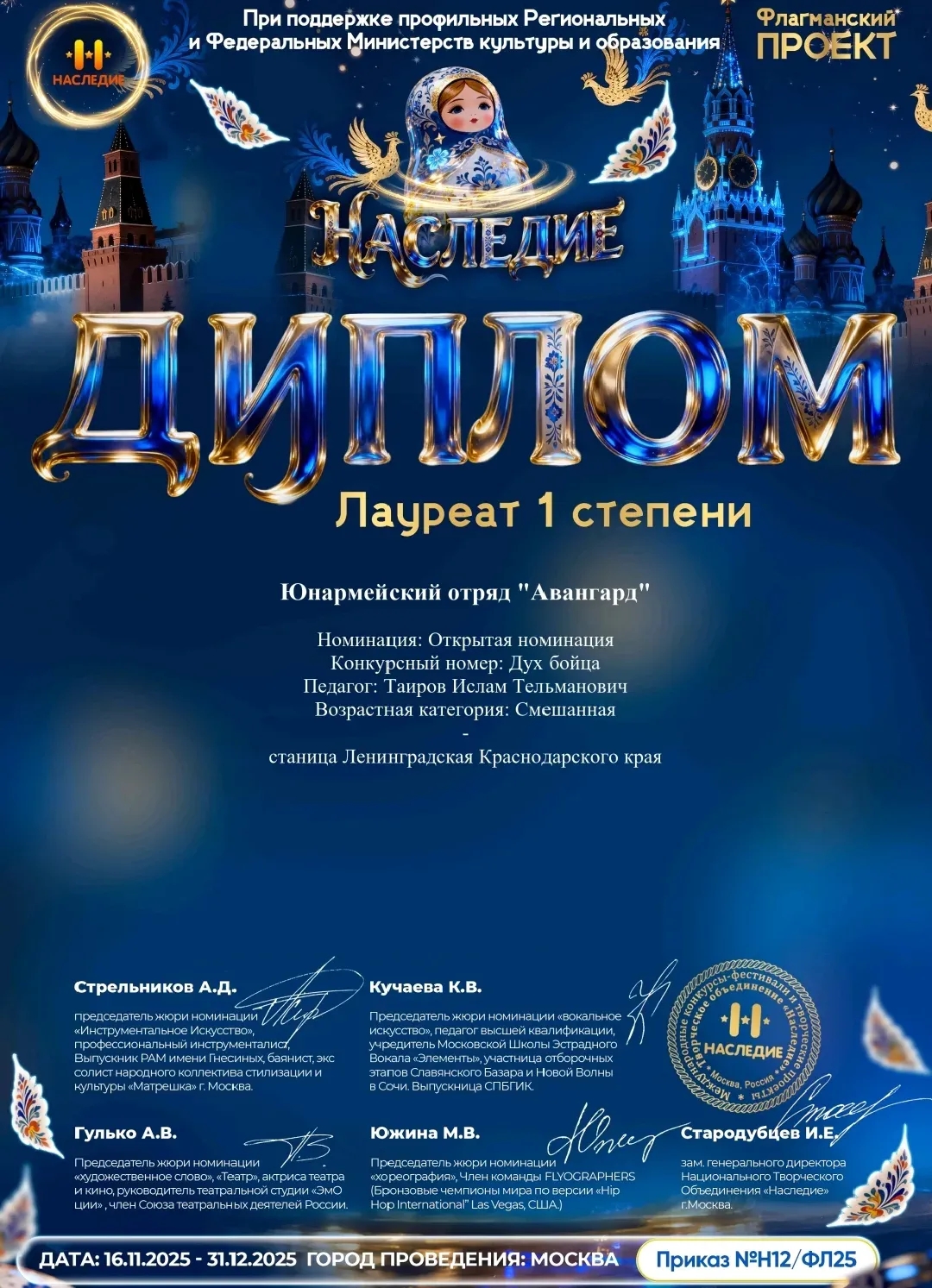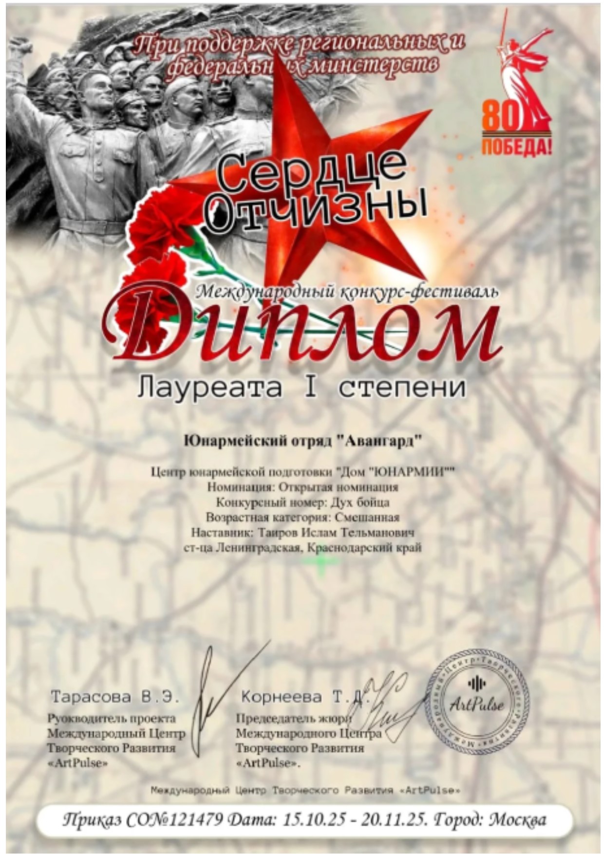 Поздравляем обучающихся Центра юнармейской подготовки «Дом «ЮНАРМИИ»» МБУДО ДЮЦ (Солодкова Данила, Теницкого Романа, Шкурко Анастасию, Брославского Владислава, Мамедова Андрея, Прокопенко Жанну, Ставинова Станислава, Левченко Тимофея, Камаеву Виолетту) и их наставника – начальника Штаба Местного отделения ВВПОД «ЮНАРМИЯ», педагога дополнительного образования МБУДО ДЮЦ Ислама Тельмановича Таирова с отличным участием (диплом лауреата I степени) в Международном конкурсе-фестивале «Сердце Отчизны».