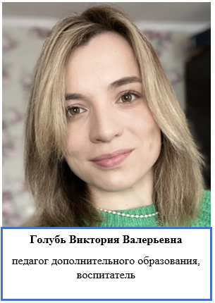 Голубь Виктория Валерьевна - воспитатель, педагог дополнительного образования, среднее профессиональное образование, квалификация - "Дошкольное образование, воспитатель детей дошкольного возраста".